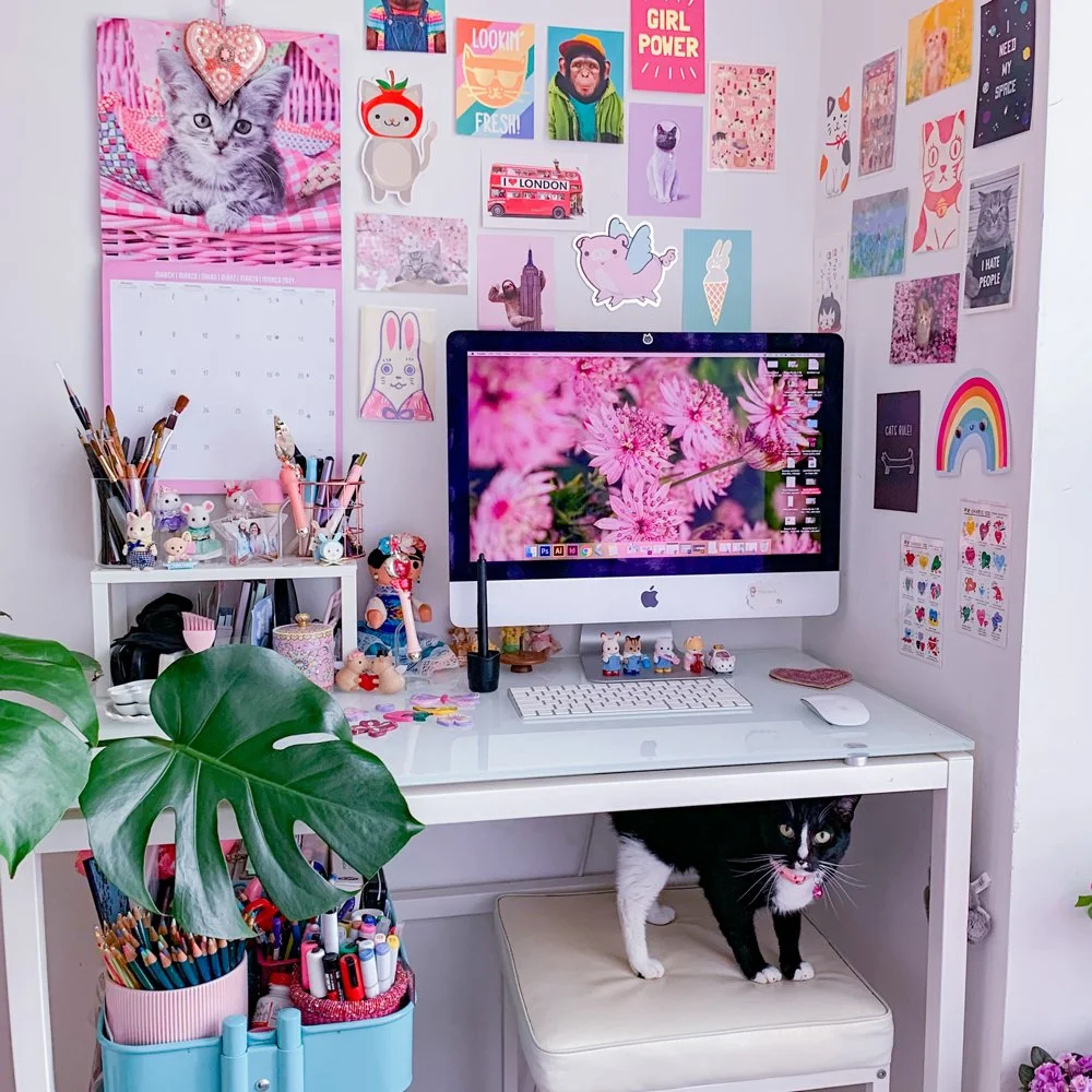 I chose to keep the walls and furniture white because I wanted to have a very luminous studio. I add colour to the space with my illustrations, plants and postcards that I’ve bought around the world.