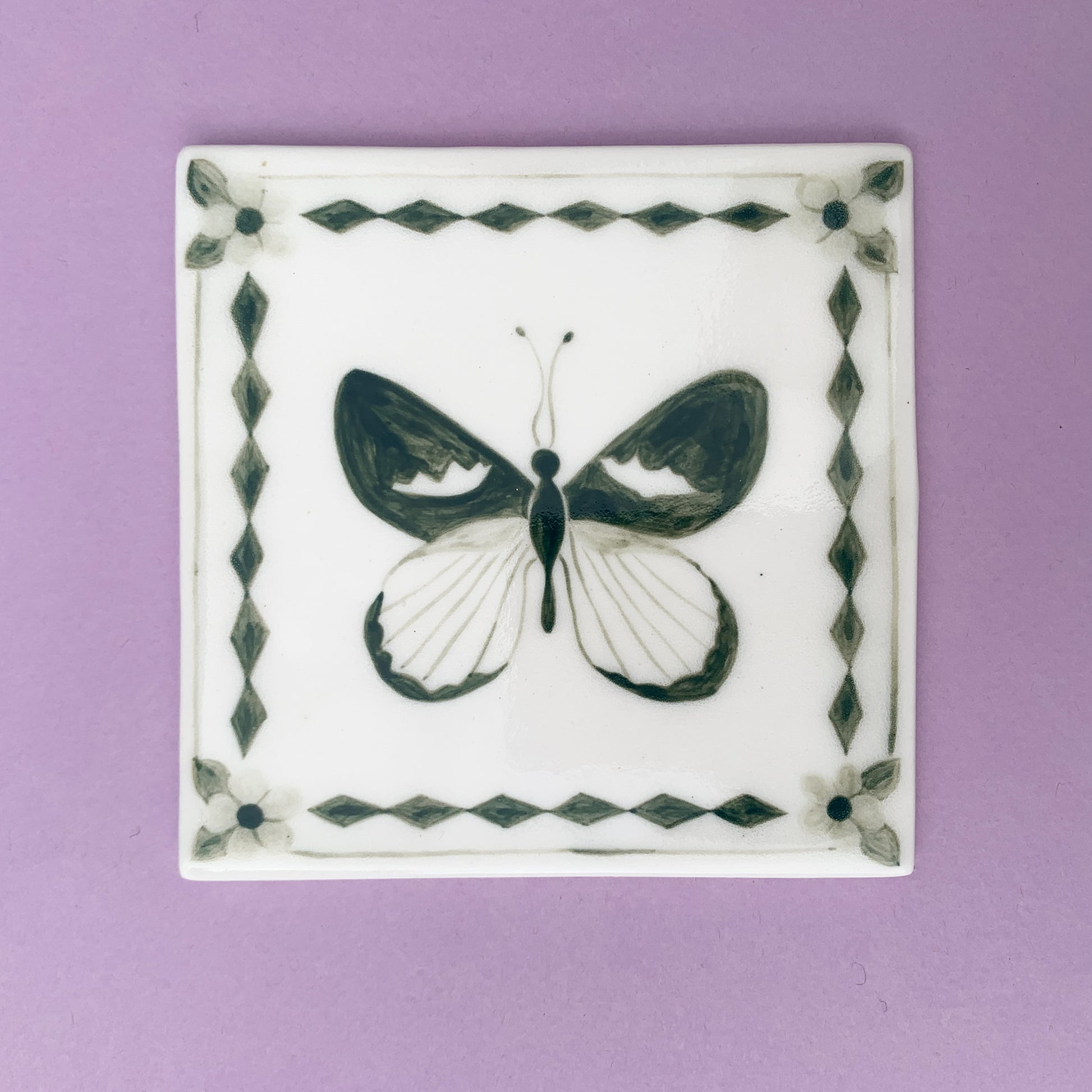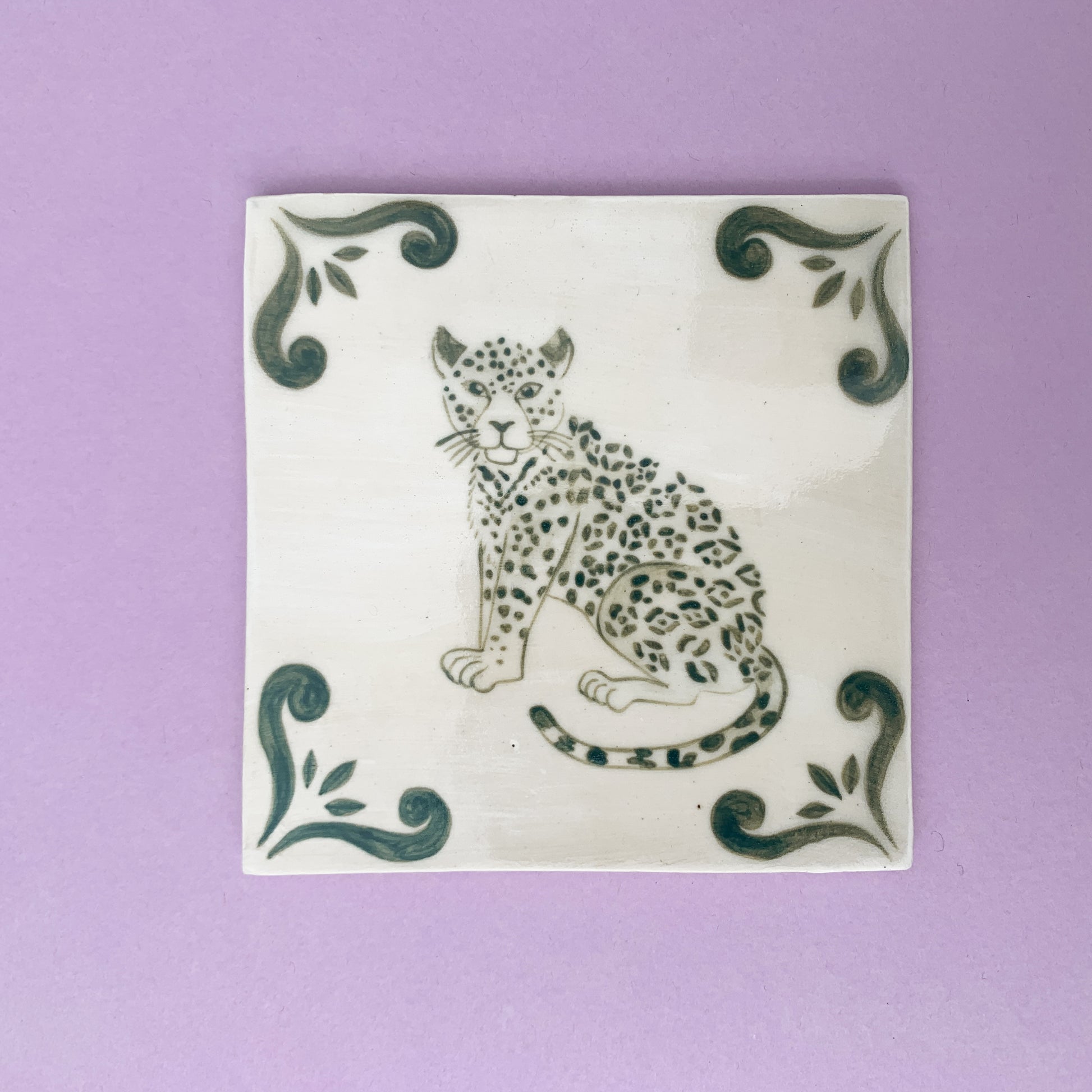 Hand-painted tiles featuring native flora and fauna from Colombia. The detailed artworks have been painted in forest green glaze with a watercolour effect. All four designs work visually together, in pairs or separately.